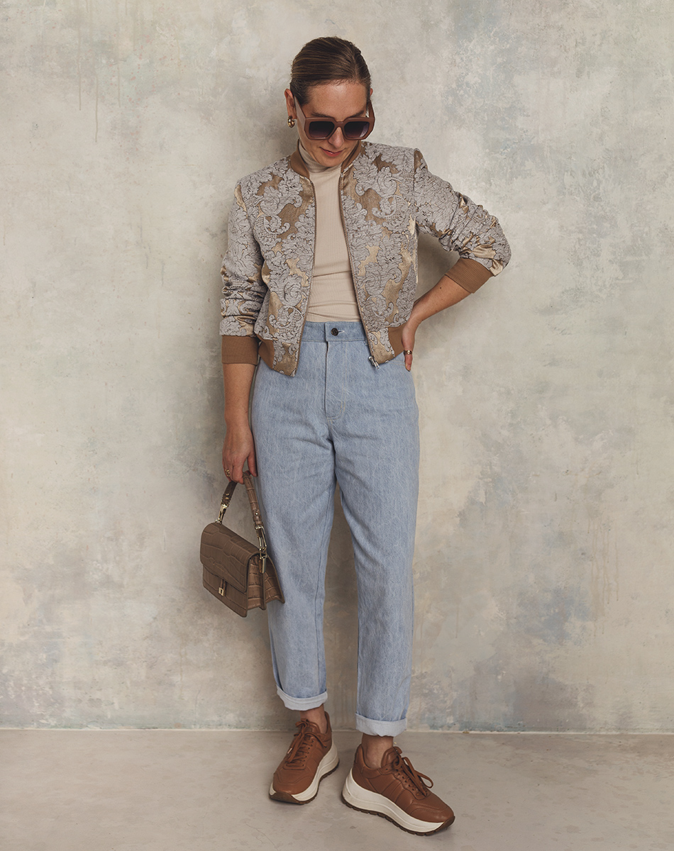 Elegancka bomberka w kolorach złota, brązu i jasnego błękitu. Uszyta z haftowanej tkaniny żakardowej. Przestrzenny haft z motywami roślinnymi w kolorze jasnoszarego błękitu nadaje kurtce oryginalnego i niepowtarzalnego eleganckiego charakteru. Z powodzeniem może zastąpić marynarkę w biznesowych stylizacjach i nie tylko. Dekolt, dół i rękawy wykończone bawełnianym ściągaczem. W całości od spodu odszyta podszewką. Bomberki mogą różnić się układem wzoru, aczkolwiek zawsze staramy się zachować symetryczność wzoru.