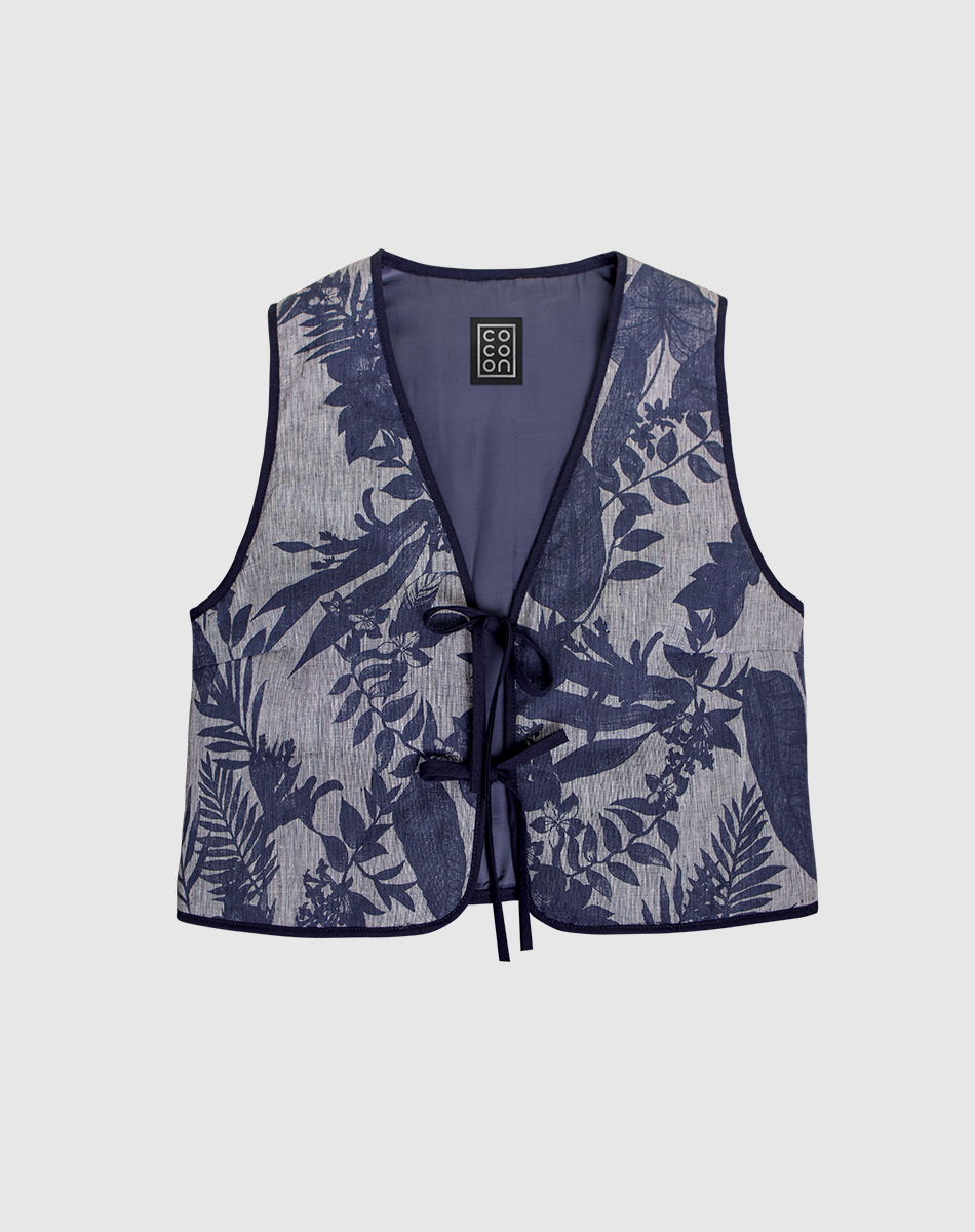 Kamizelka z wiązaniami z roślinnym printem, uszyta z wysokogatunkowej bawełny. Brzegi wykończone granatową lamówką. Od spodu odszyta wiskozową podszewką.