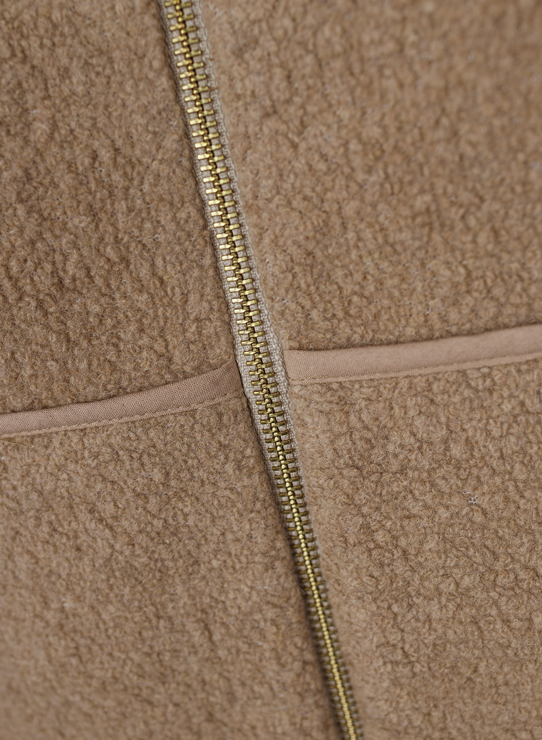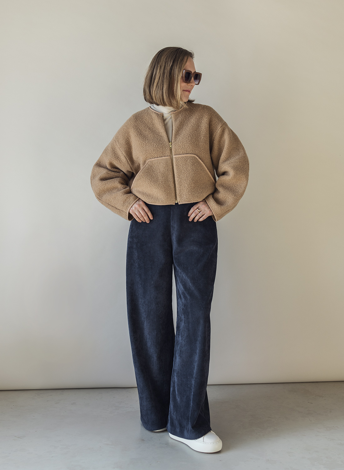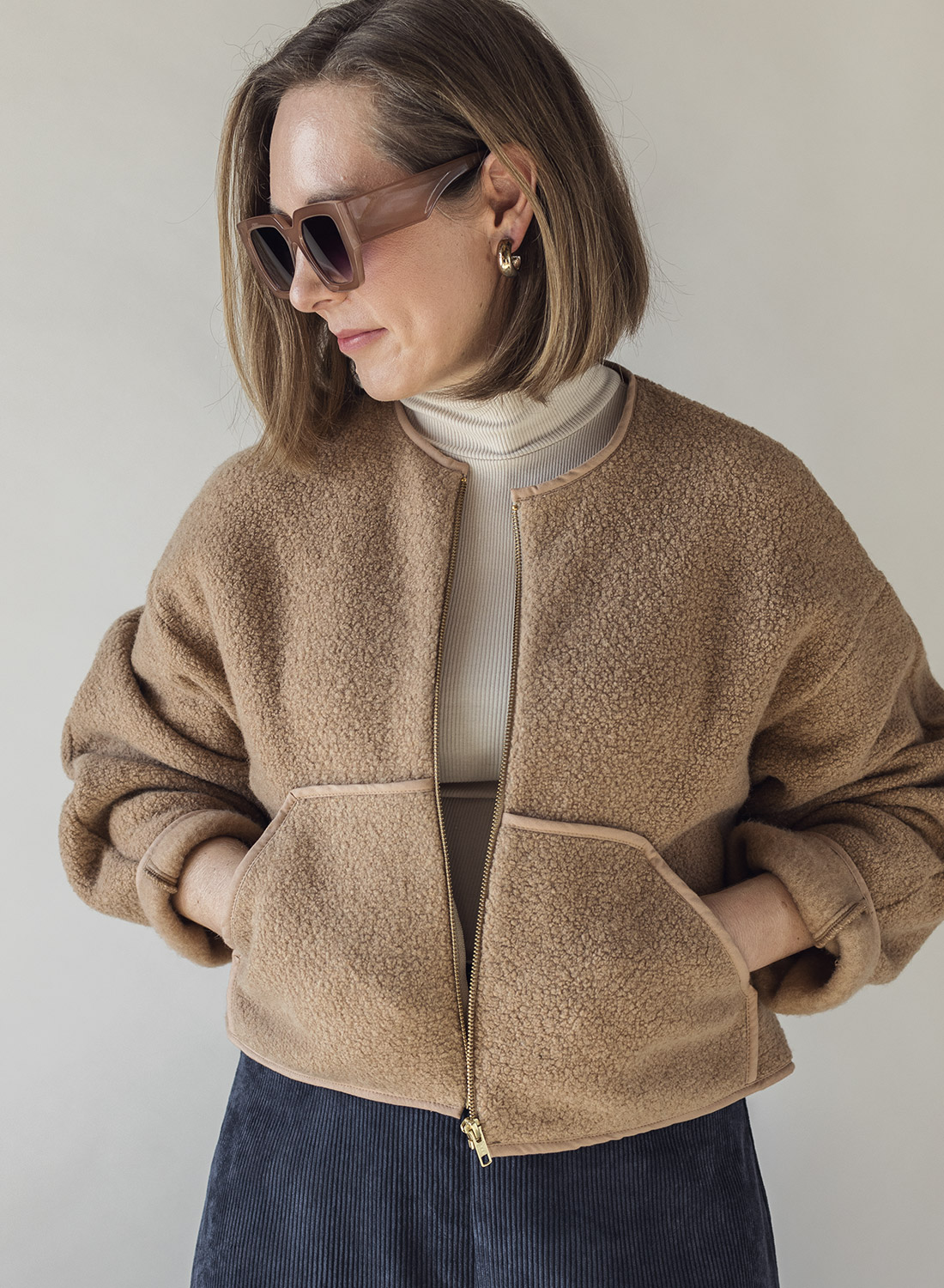 Krótka, wełniana kurtka zapinana na zamek z powłoką antyniklową (zapobiega uczuleniom). Dół, rękawy i dekolt wykończone lamówką. Dwie kieszenie z przodu.