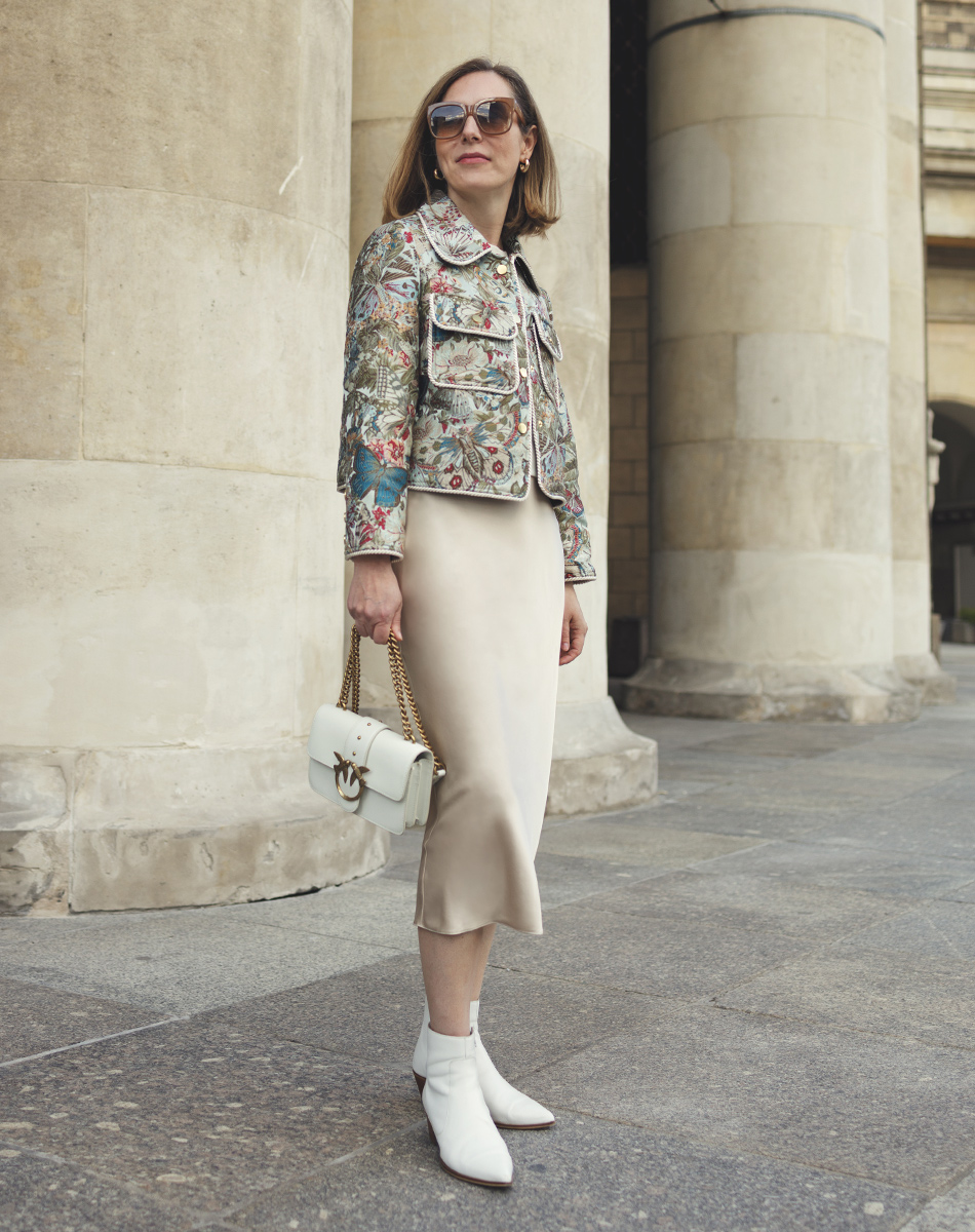 Elegancka kurtka z haftowanej tkaniny żakardowej, w kolorach khaki z motywem natury. Z przodu zapinana na zatrzaski w kolorze złotym. Brzeg całej kurtki w tym kieszenie, kołnierz i rękawy zostały wykończone eleganckim zwijanym sznurkiem w jasnym kolorze. W całości od spodu odszyta podszewką. Sprawdzi się doskonale zarówno na wszelkich uroczystościach, jak również na co dzień uzupełniając proste i minimalistyczne stylizacje, nadając im niepowtarzalnego i oryginalnego charakteru. Kurtki mogą różnić się układem wzoru. Na zdjęciu Ula (167cm wzrostu) ma na sobie rozmiar M.