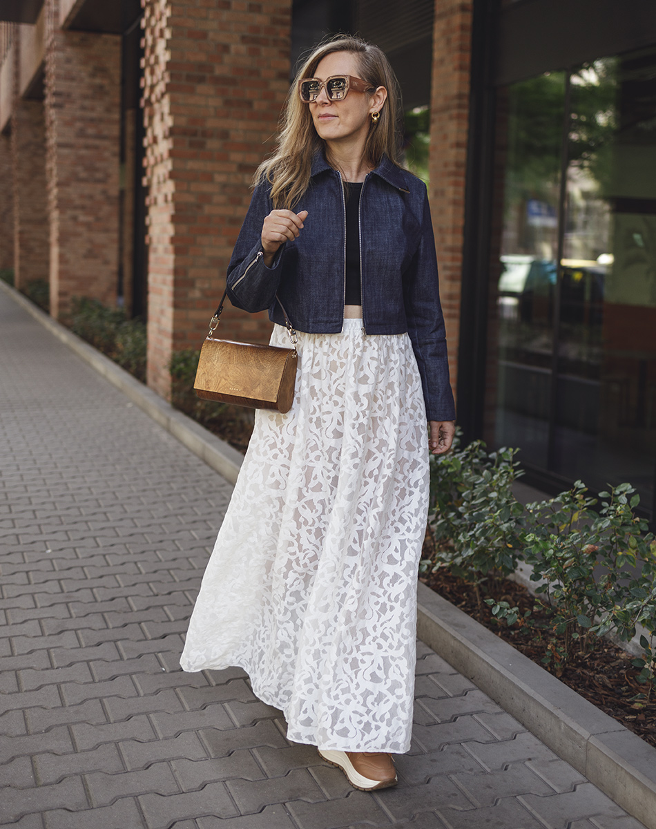 Koronkowa, biała, rozkloszowana, maxi spódnica. Pas na gumie, dzięki czemu dopasowuje się do obwodu. Stylowa i efektowna. Świetnie sprawdzi się w stylizacjach z topami, t-shirtami, marynarkami a nawet bluzami dresowymi.