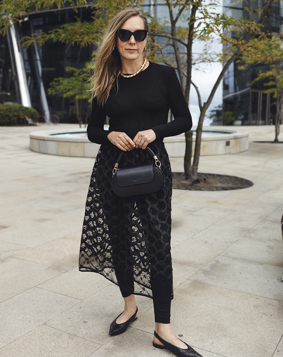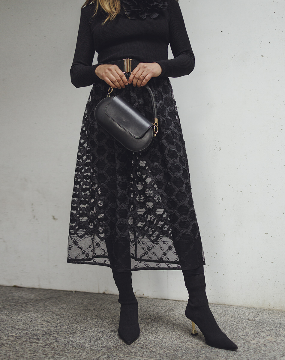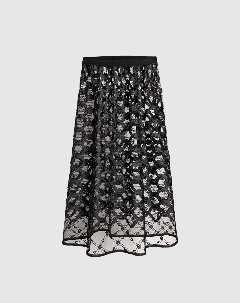 Ażurowa, czarna, lekko rozkloszowana spódnica, uszyta z transparentnego materiału przypominającego koronkę. Pas na gumie, dzięki czemu dopasowuje się do obwodu. Stylowa i efektowna. Świetnie sprawdzi się w stylizacjach z topami, t-shirtami, marynarkami a nawet bluzami dresowymi.