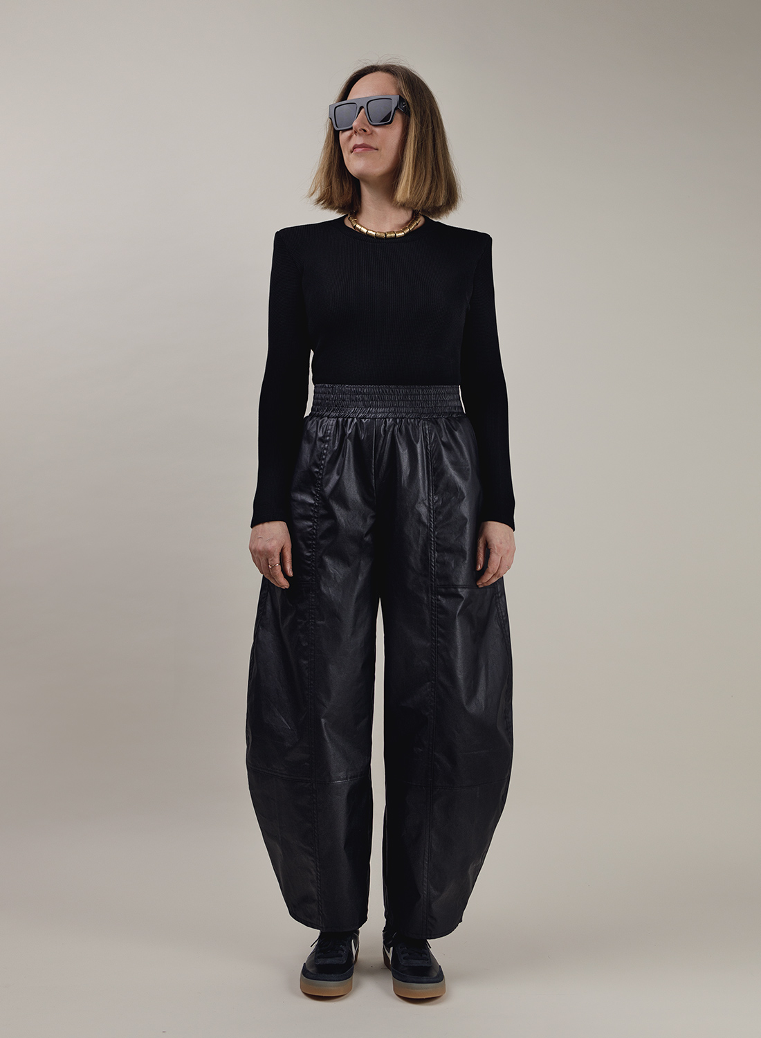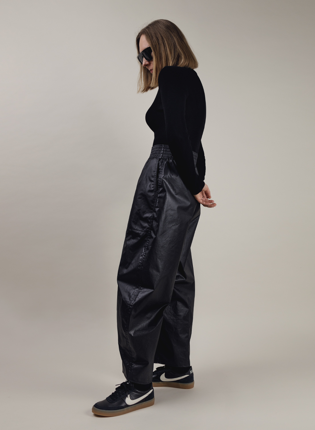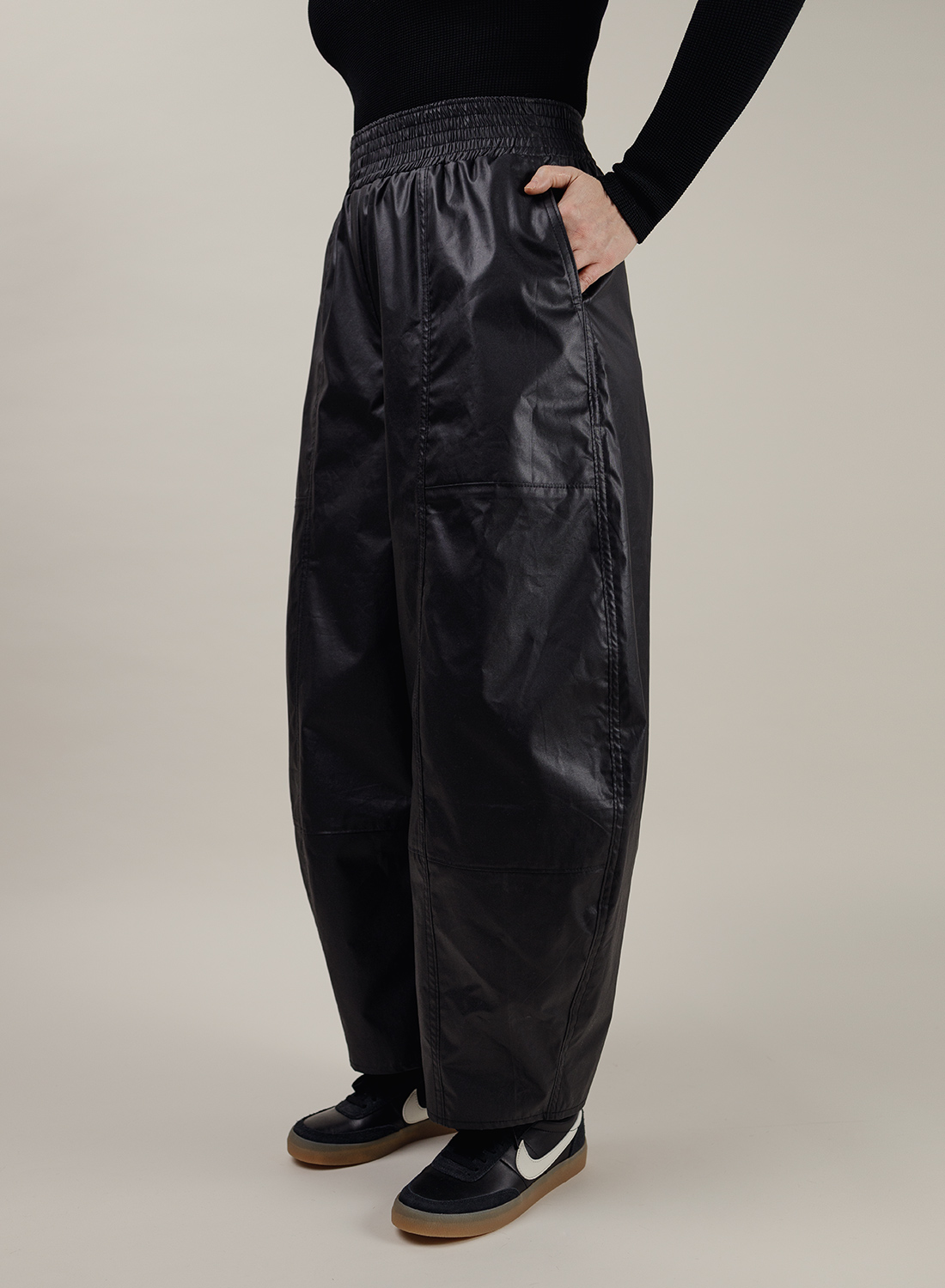 Cienkie spodnie, o kroju balonowym, uszyte z czarnej powlekanej bawełny w błyszczącym wykończeniu. Luźne nogawki zwężone na dole. Pasek na pikowanej gumie.