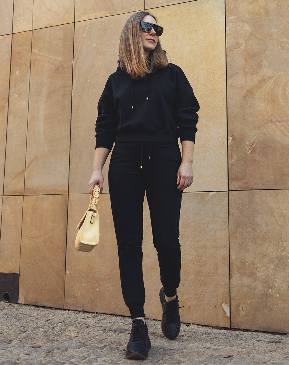 Joggersy są uszyte z super miękkiej i przyjemnej w dotyku wysokogatunkowej dzianiny bawełnianej certyfikowanej znakiem OEKO-TEX. Dół spodni i pas wykończone bawełnianym ściągaczem. Kolor czarny. Dzianina z meszkiem od spodu. Ściągane sznurkiem w tali. Na zdjęciu Ula (167cm wzrostu) ma na sobie rozmiar S.
