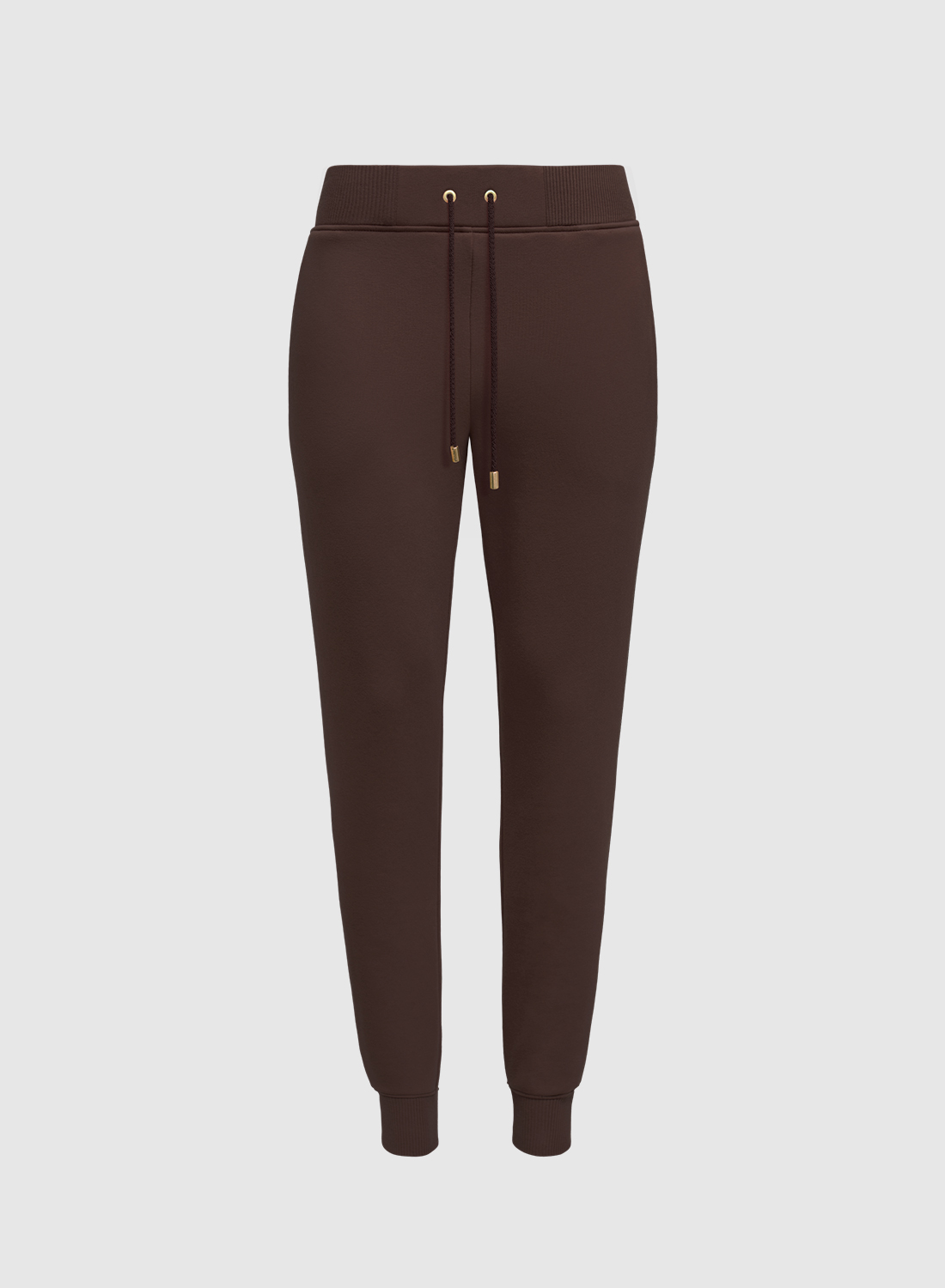 Joggersy są uszyte z super miękkiej i przyjemnej w dotyku wysokogatunkowej dzianiny bawełnianej certyfikowanej znakiem OEKO-TEX. Dół spodni i pas wykończone bawełnianym ściągaczem. Kolor czekoladowy. Dzianina z meszkiem od spodu. Ściągane sznurkiem w tali.