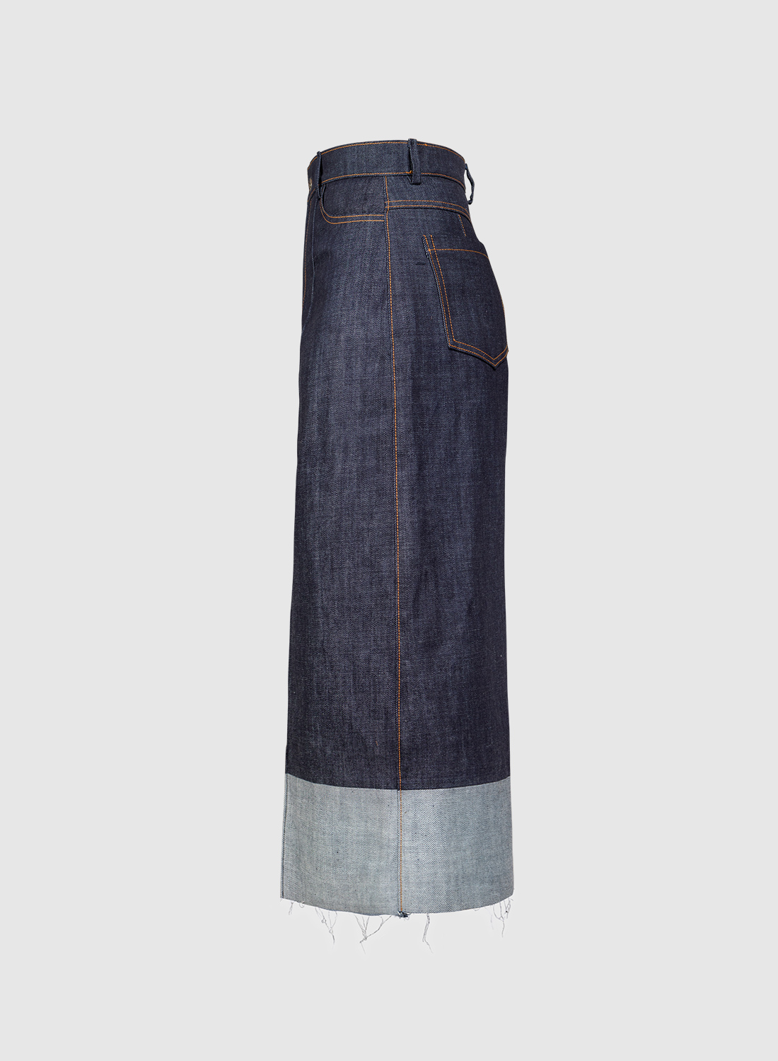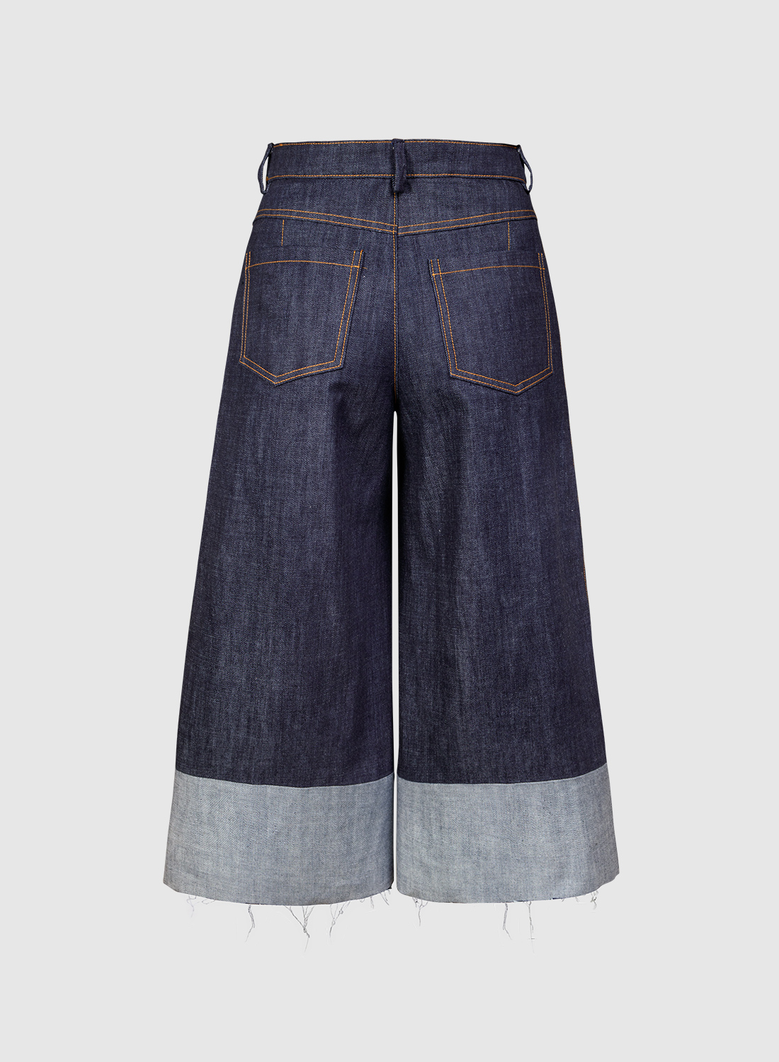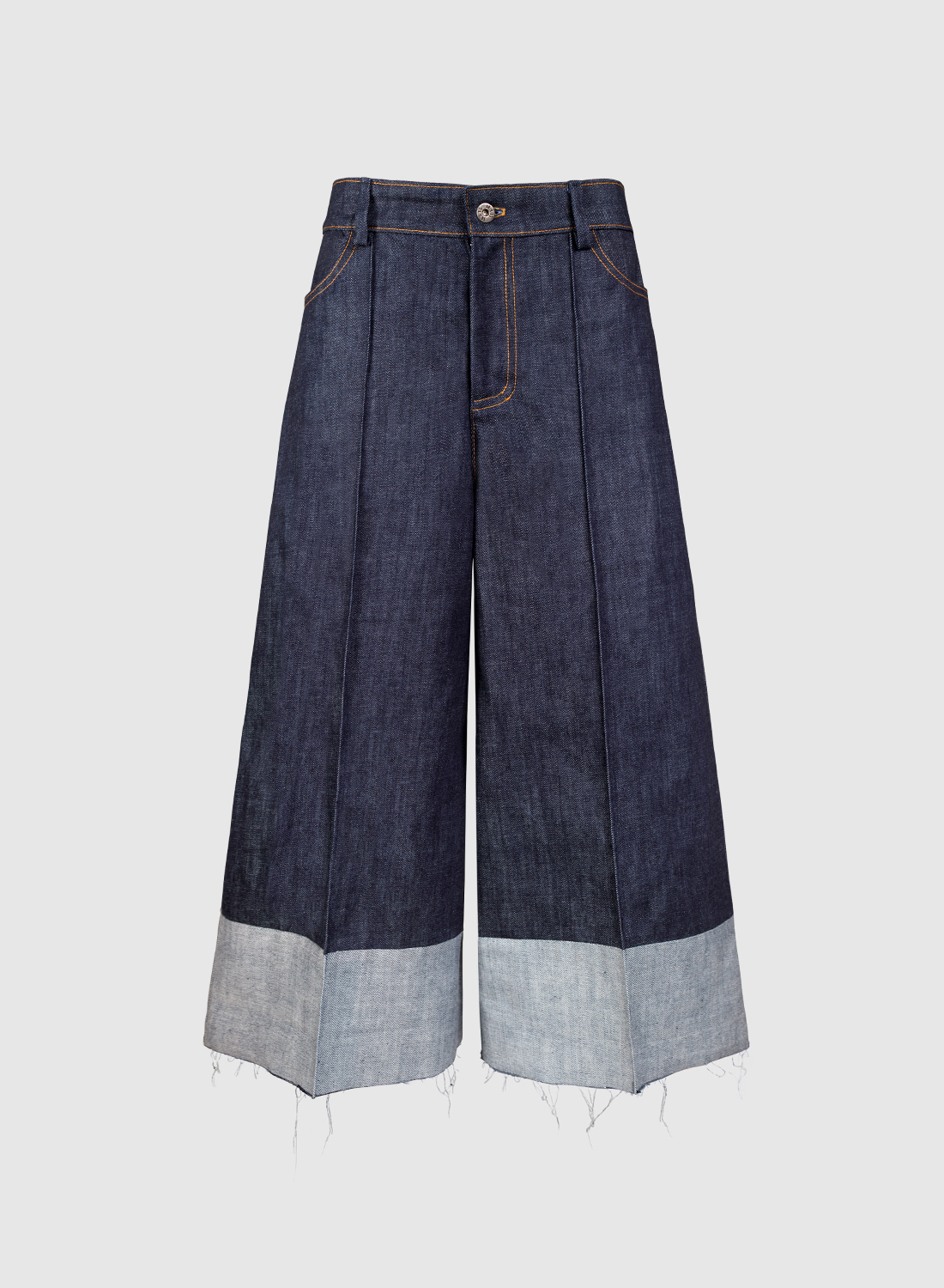 Klasyczne spodnie jeansowe typu kuloty z szerokimi nogawkami o długości 7/8 i przeszytym kantem z przodu. Nogawki na dole wykończone jasnym pasem markującym wywinięcie nogawek oraz surowym zakończeniem bez obrębiania. Dwie kieszenie z przodu i z tyłu, zapinane na klasyczny zamek z powłoką anty-niklową (przeciw alergiczny) wszyty w rozporku.