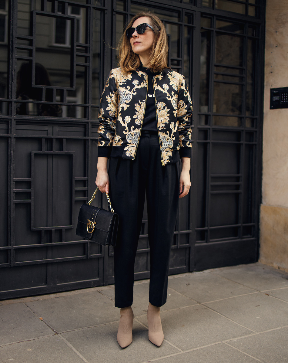 Eleganckie, garniturowe spodnie z zakładkami. Krój z nogawkami zwężającymi się do dołu. Uszyte z cienkiej wysokogatunkowej włoskiej tkaniny wełnianej w kolorze czarnym. Tkanina zawiera domieszę spandexu, dzięki czemu jest lekko elastyczna, dzięki czemu spodnie są bardzo wygodne i nie krępują ruchów. Na zdjęciu Ula (167 cm wzrostu) ma na sobie rozmiar M.