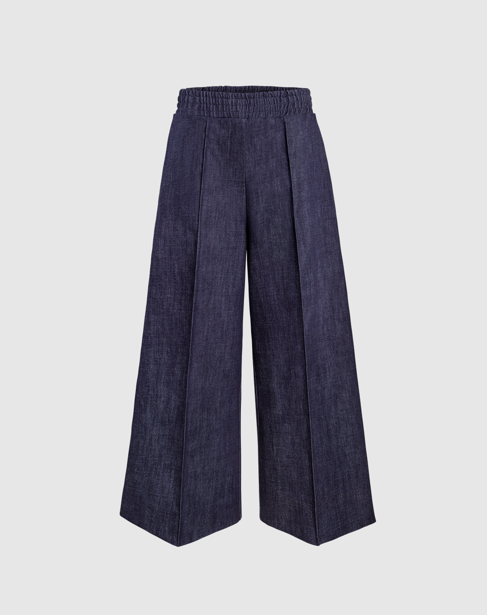 Spodnie jeansowe typu palazzo z szerokimi nogawkami. Spodnie posiadają pas na szerokiej gumie, która stabilizuje a jednocześnie dopasowuje się do obwodu, przez co spodnie są bardzo wygodne w użytkowaniu.