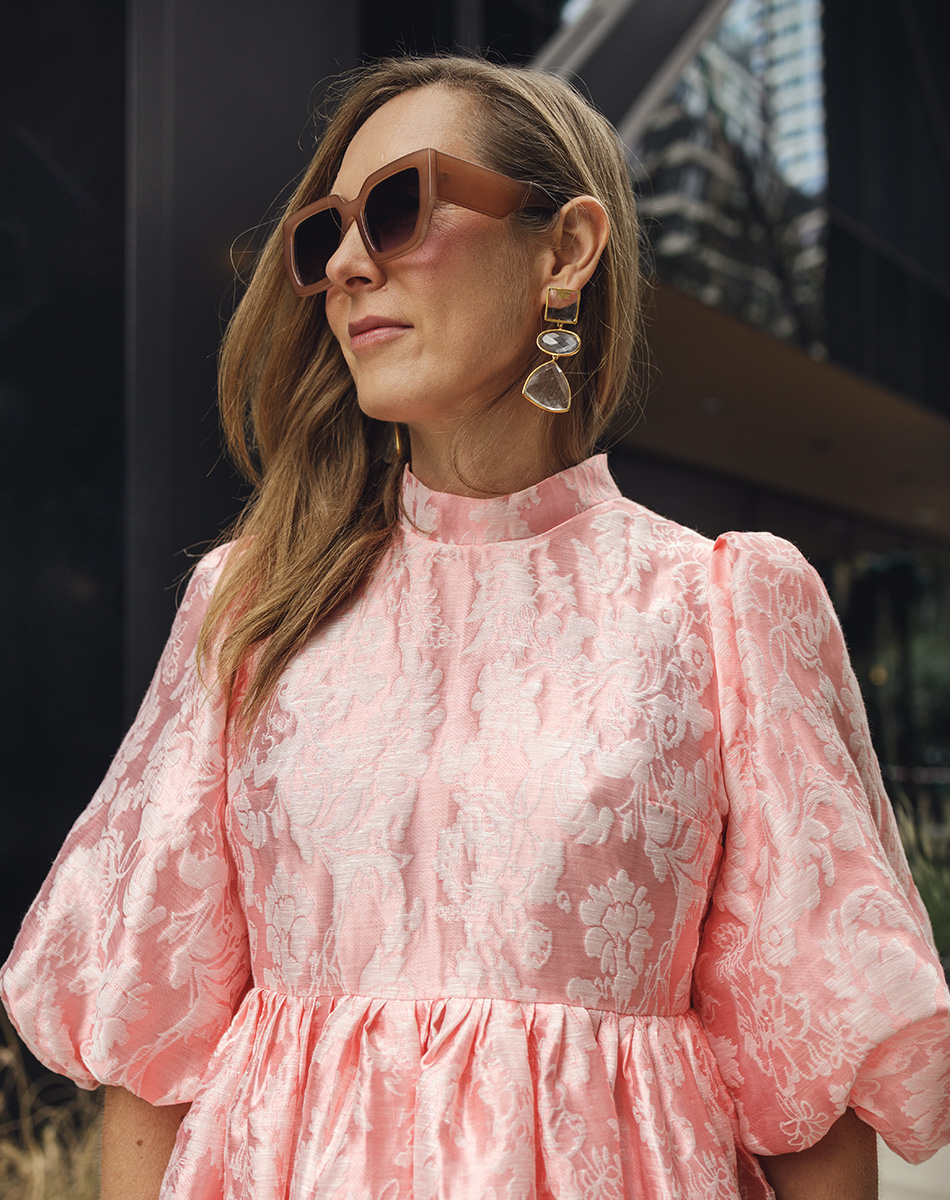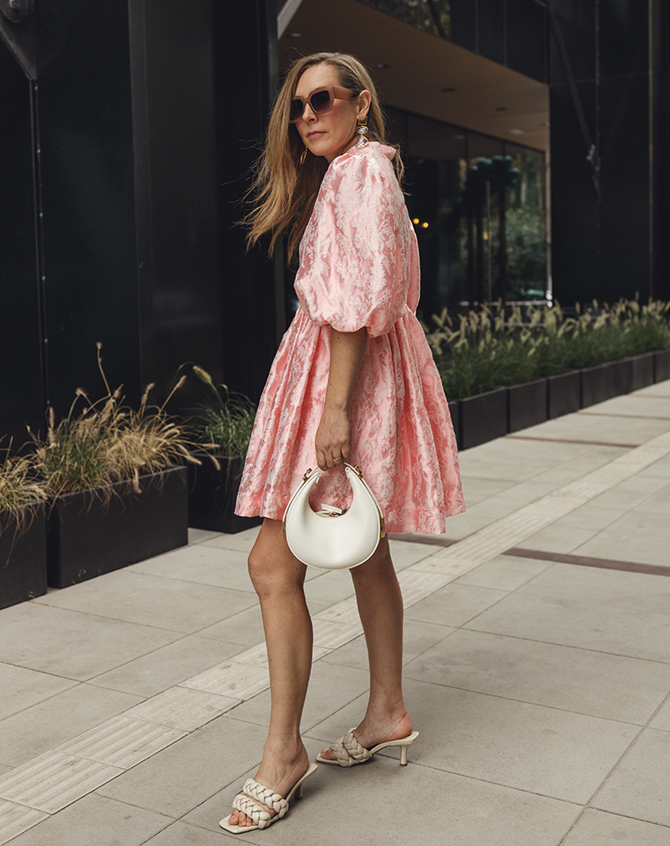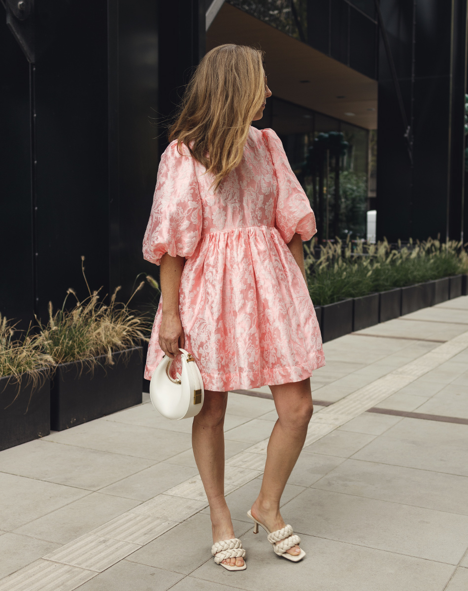 Sukienka mini (przed kolano) z bufiastymi, krótkimi rękawami w kolorze kremowej bieli. Uszyta z z przepięknej żakardowej tkaniny w ornamentalny wzór z motywem kwiatowym , całość odszyta od spodu wizkozową podszewką. Z tyłu zapinana na kryty zamek. Dekolt wykończony małą stójką.