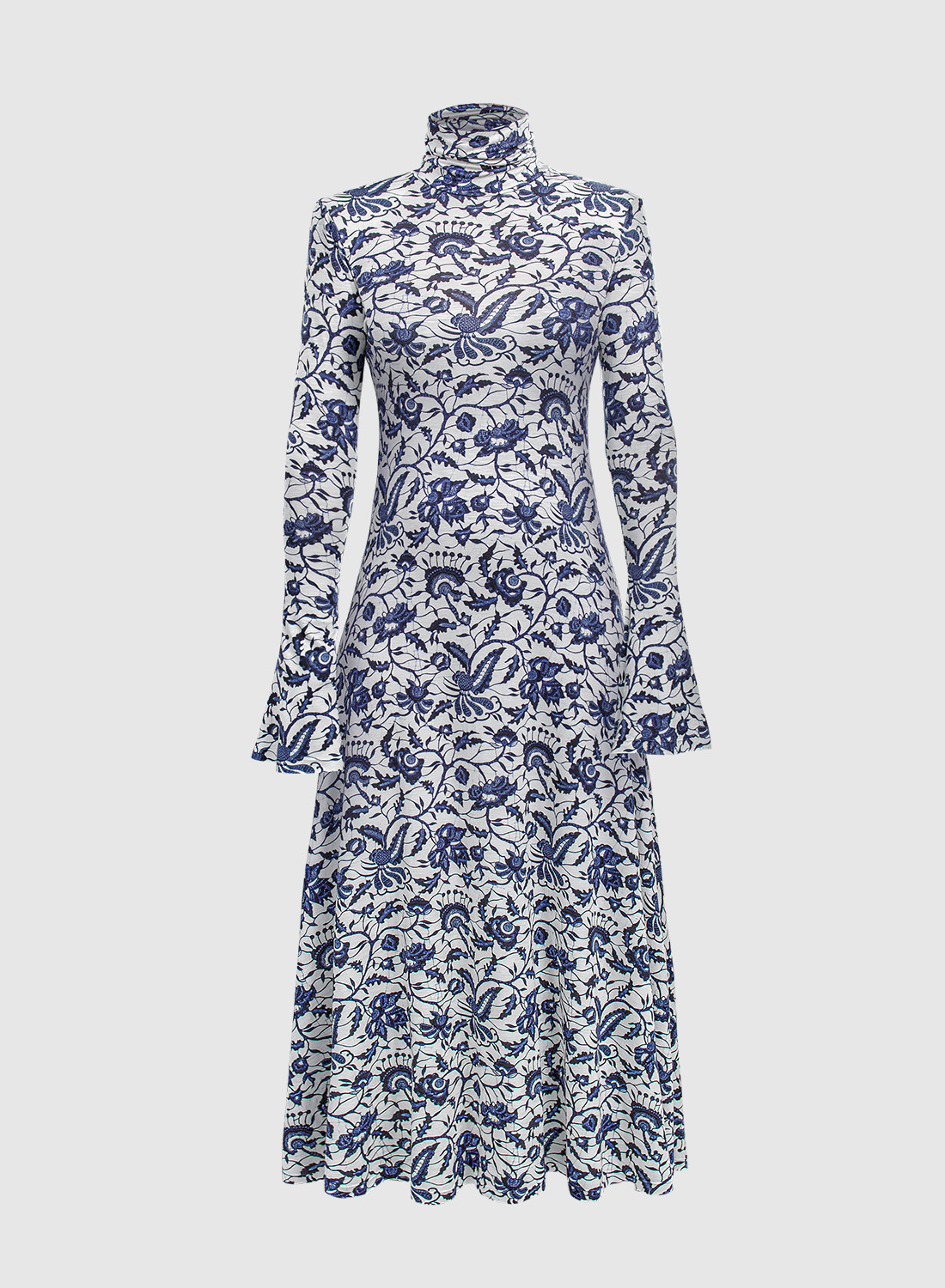 Sukienka maxi z mankietami w kształcie dzwonka i golfem. Uszyta z bardzo przyjemnej w dotyku, wysokogatunkowej dzianiny wiskozowej z printem roślinnym w niebieskie kwiaty. Dzięki elastycznej dzianinie sukienka dopasowuje się do Twojej sylwetki, podkreślając figurę, a jednocześnie zapewnia pełną swobodę ruchów, a dzięki wzorzystemu printowi jest w stanie ukryć co nieco ;) Zjawiskowa a jednocześnie bardzo praktyczna i wygodna.