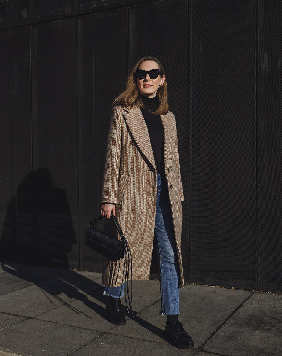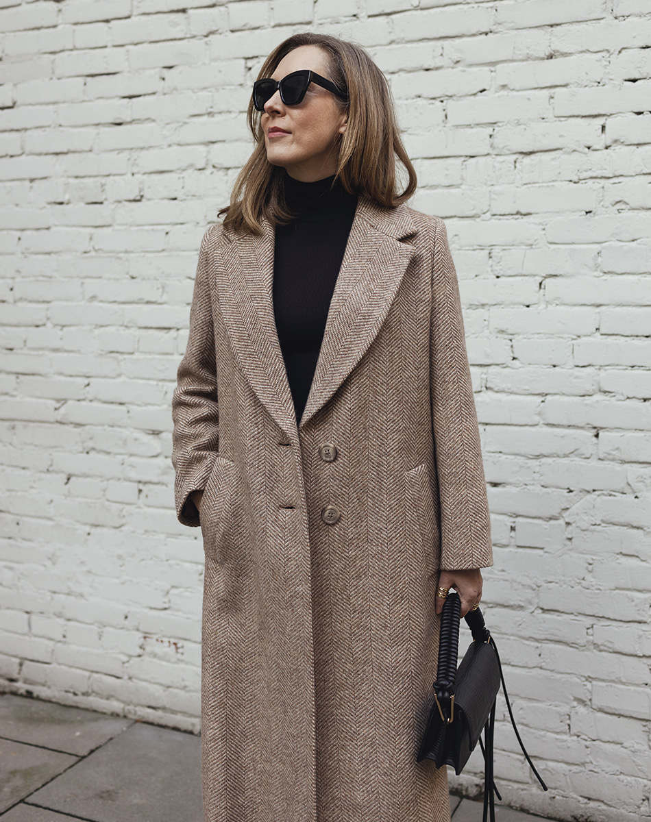 Długi wełniany płaszcz jednorzędowy o klasycznym kroju. Płaszcz uszyty z wysokogatunkowej włoskiej wełny virgin w deseń jodełki (brązowy/kremowy biały). Wełna typu VIRGIN to najdelikatniejsza wełna na rynku, ale nie tylko to czyni ją wyjątkową, ponieważ posiada ona wiele bardzo praktycznych właściwości tj. m.in. lekkość, hipoalergiczność w tym odporność na rozwój roztoczy, absorpcyjność wody, higrofobowość (chroni przed powstawaniem plam na ubraniach) oraz co najważniejsze termoizolacyjność i zdolność do termoregulacji (zapobiega przegrzaniu i przemarznięciu organizmu, regulując temperaturę). Płaszcz od spodu odszyty jest wiskozową podszewką. Z przodu dwie kieszenie. Zapinany na dwa guziki.